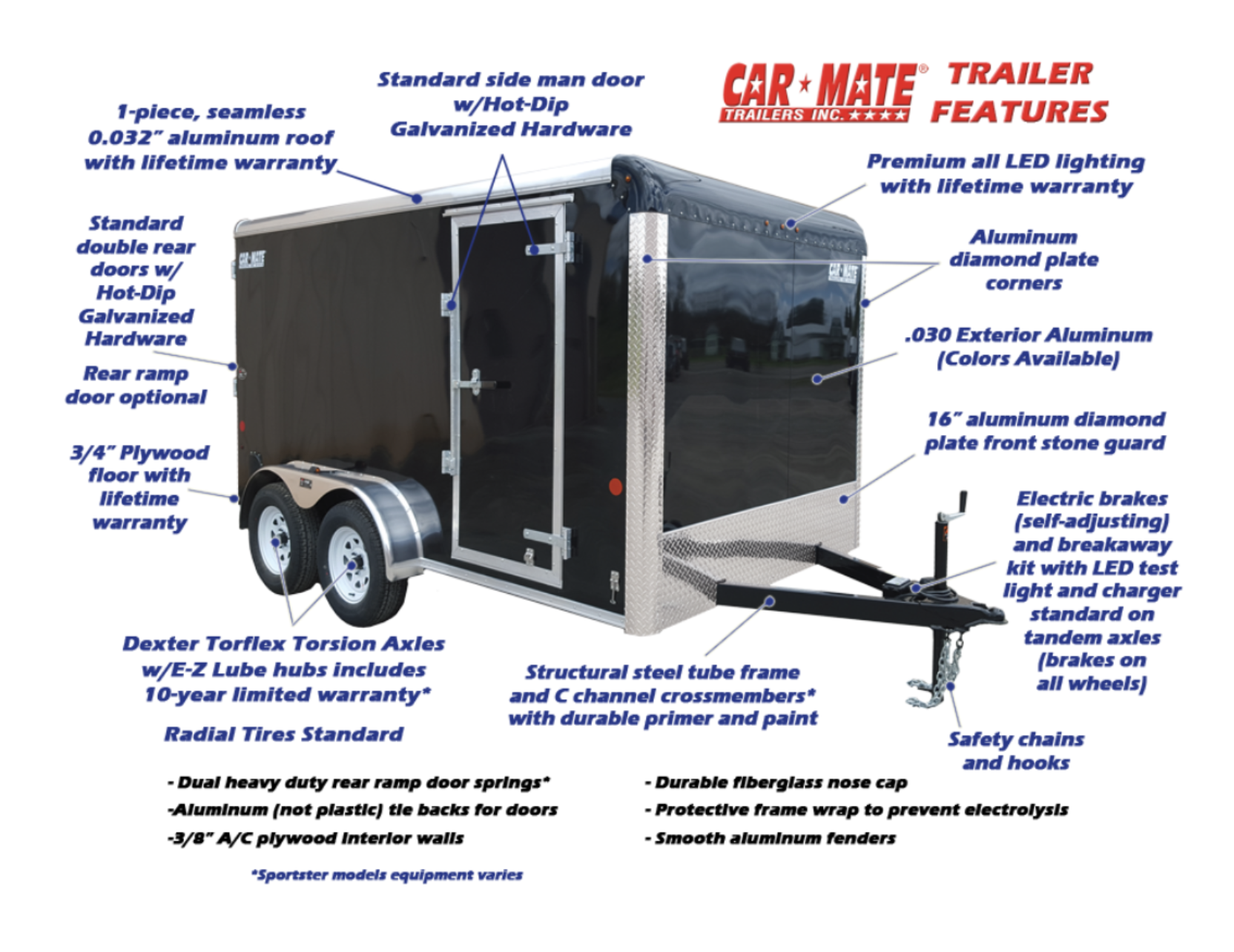 Car Mate Trailers are equipped with numerous standard features, as shown in the Trailer Features section above. Car Mate also features several “Packages” that combine the most popular options.